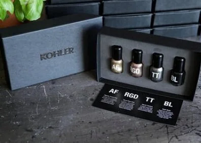 Kohler’s Finish to Order program encourages self expression through customizable faucet finishes. To promote this program, we created a series of nail polishes that matched our hardware. These beauties have been the perfect giveaway at events like Art Basel Miami Beach to remind women that they can look stunning inside and outside of the home.