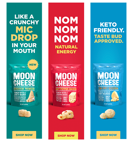 Moon Cheese, a crunchy, 100% cheese snack was looking to emerge in the ever-popular natural snacks category. Instead of using neutral colors and wholesome messaging like every other competitor out there, we turned the volume up to 11 with loud colors, bold messaging and a tagline that said it all, “Crank Up the Crunch”.